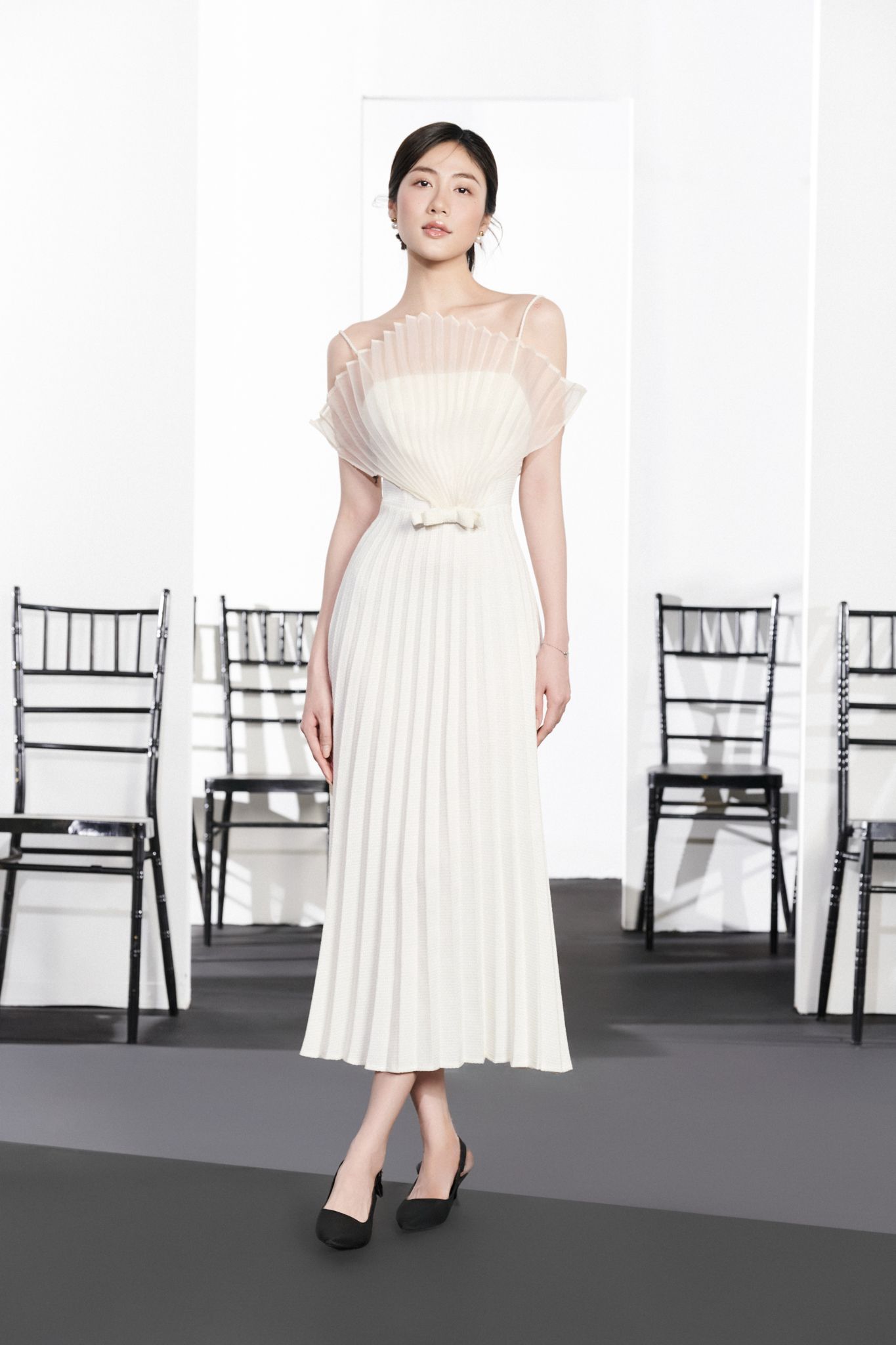 - Chất liệu: Gân dày màu kem phối voan kem
